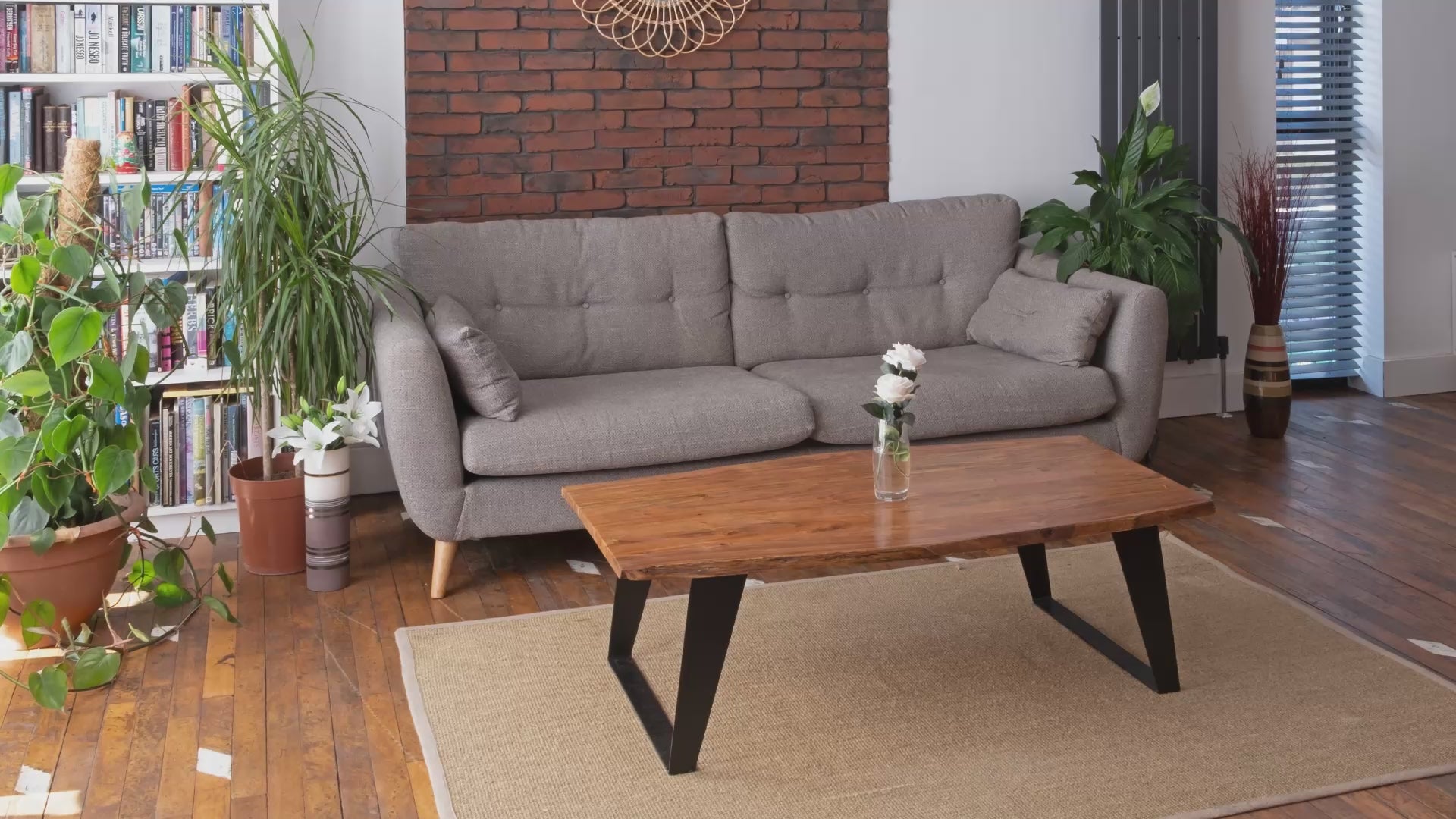 Handmade out of a thick heavy slab of polished Acacia wood (Environmentally Sustainable Hardwood) Set on heavy industrial black iron bench legs, This contemporary coffee table had had its edge's left live to give a natural finish.