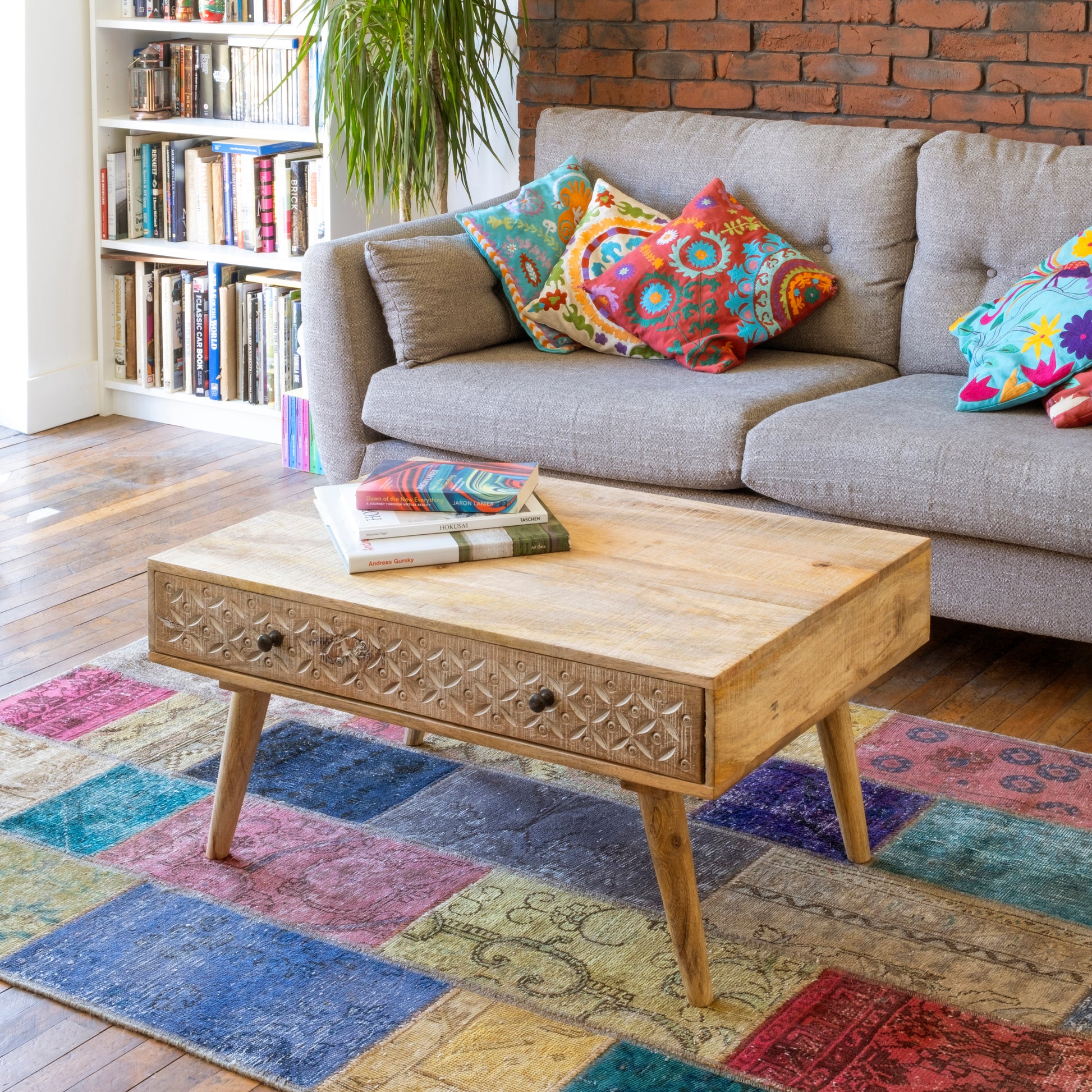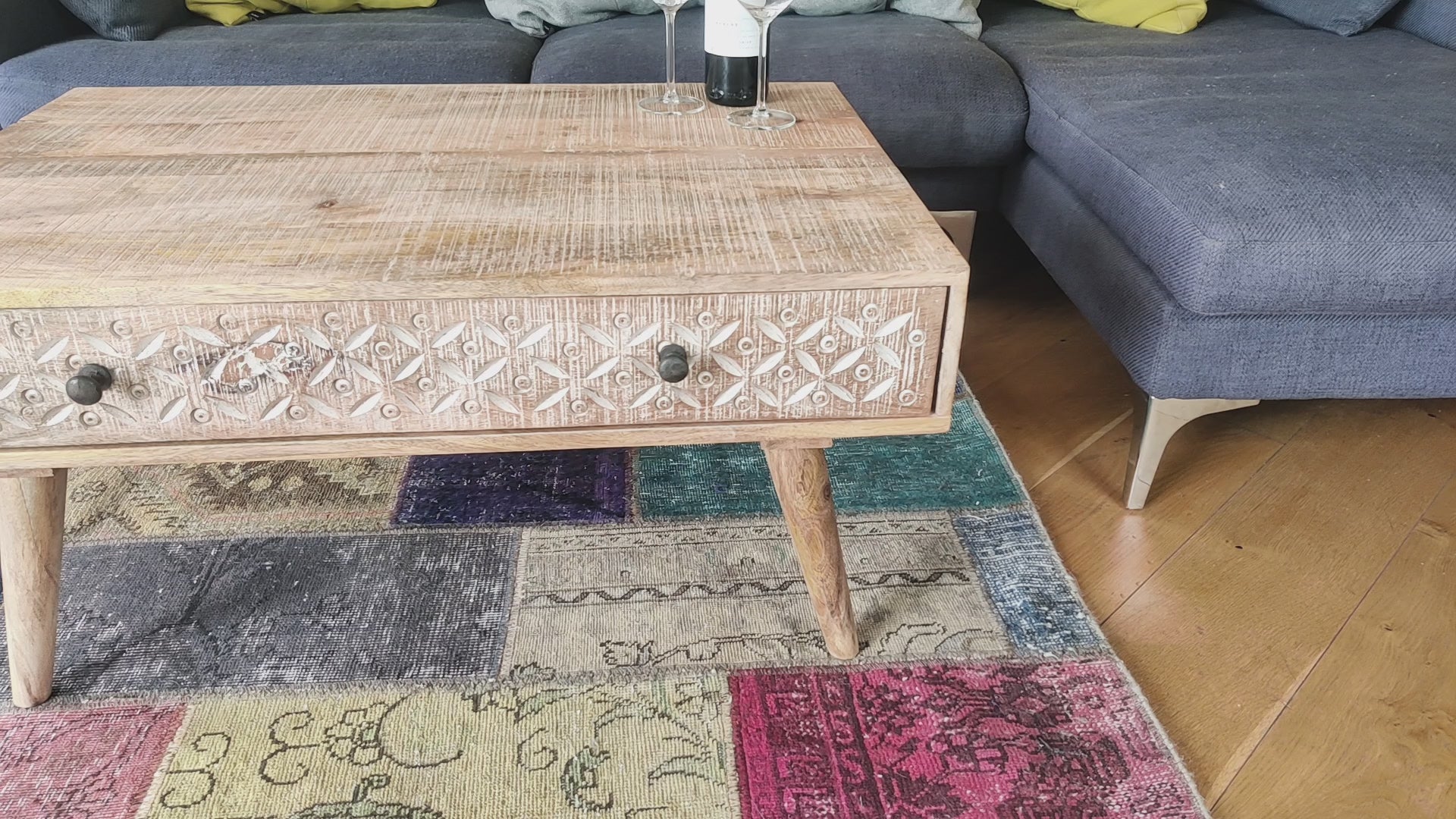 Handmade out of F.S.C certificated Mango wood, a sustainable growth hardwood. The Coffee table has been slightly distressed lime washed and then polished. The drawer has been beautifully hand carved in geometric pattern work. A good sized Coffee table with plenty of storage. Will complement both a contemporary or country living space