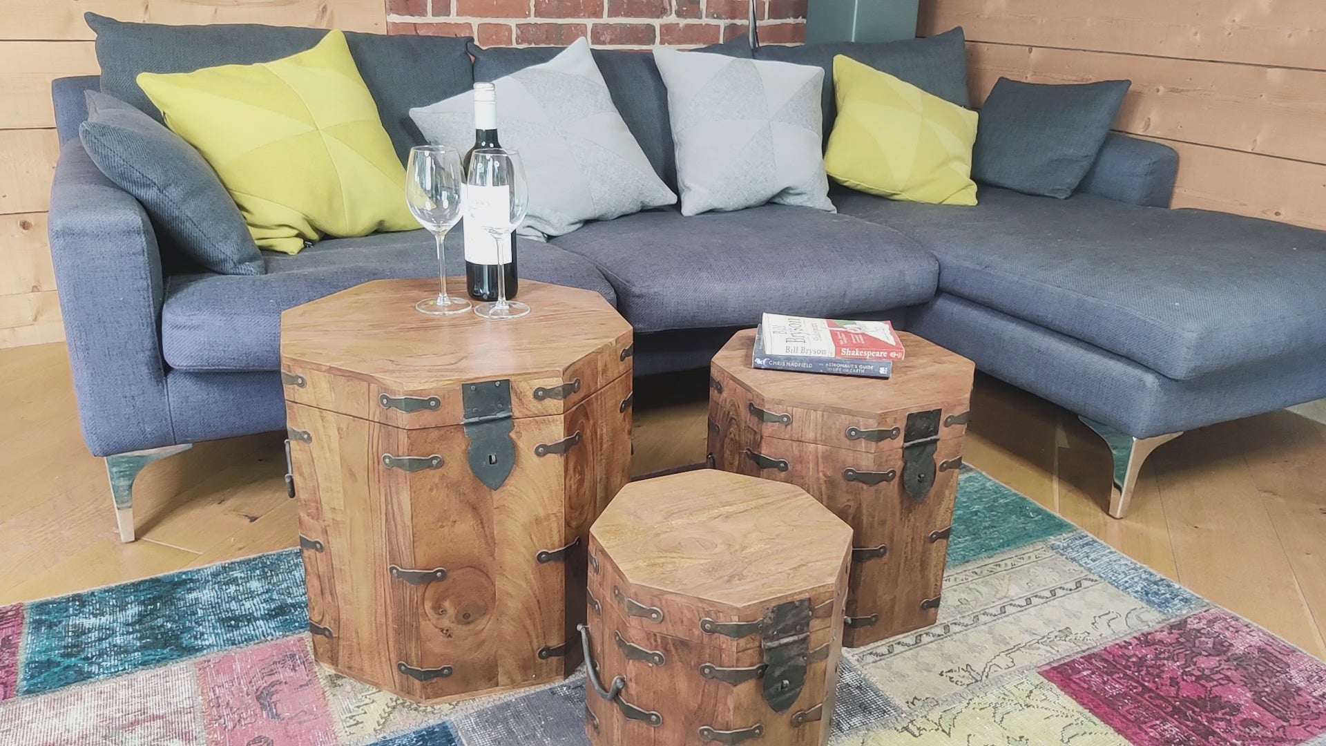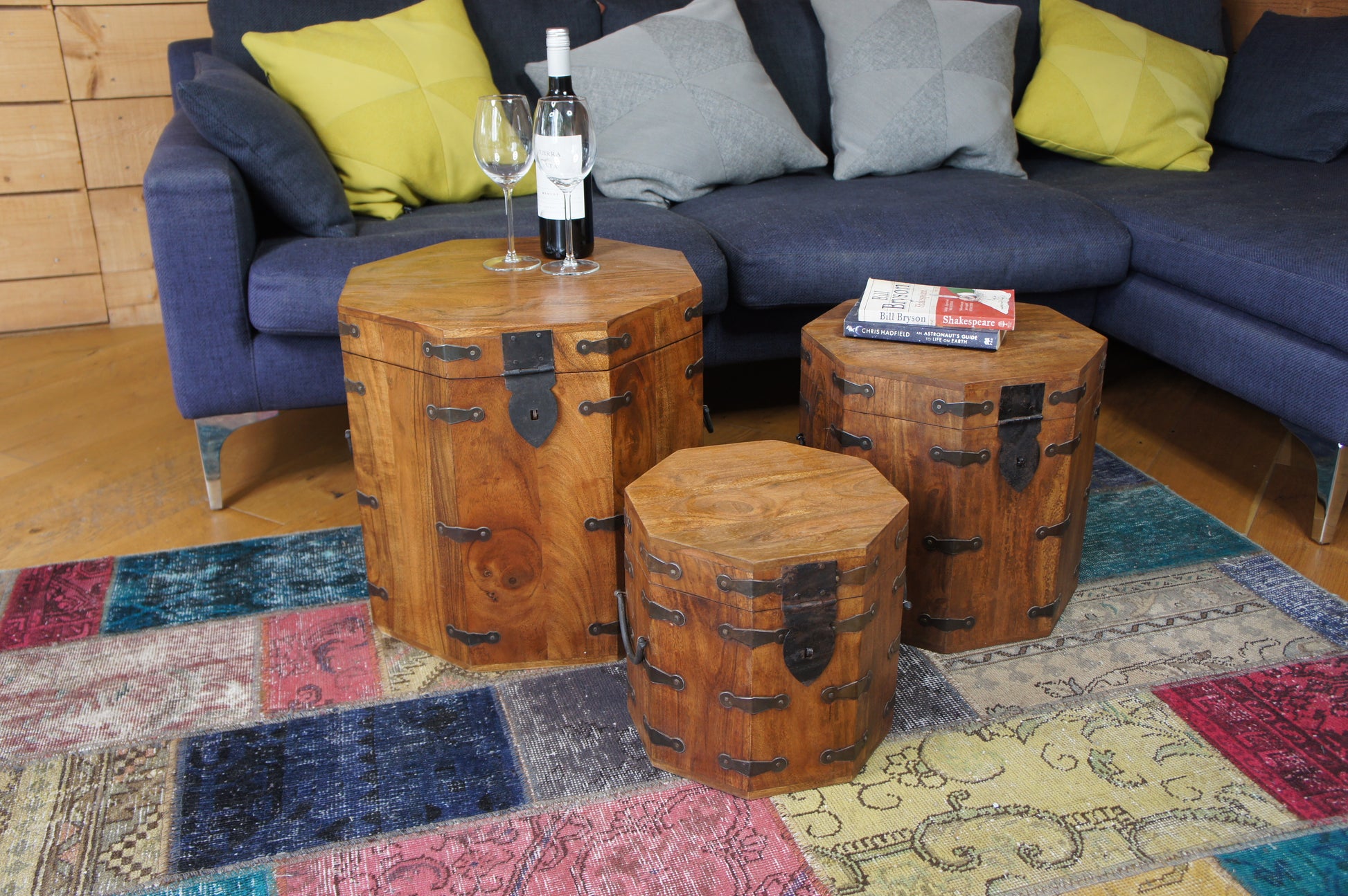 Octagonal Set of 3 Chests side table Acacia wood
